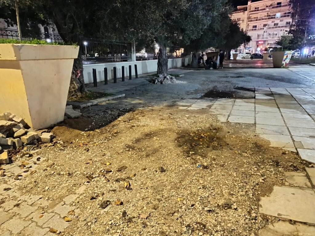Πλάκες ξηλωμένες, χώματα, νερά και λάσπες. Αυτό το σκηνικό θα αντικρύσει όποιος βρεθεί στον πεζόδρομο που φιλοξενεί ένα από τα πιο ιστορικά κτίρια της πόλης, αυτό του Δημοτικού Σχολείου της Ακαδημίας και το παρακείμενο Πάρκο Ακαδημίας (Πλατεία Εθνικής Ανεξαρτησίας).
