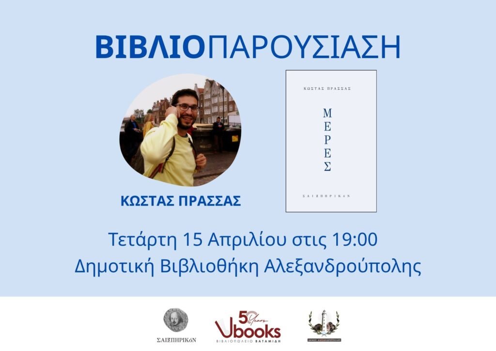 Το βιβλιοπωλείο Βαταμίδη vbooks.gr και οι εκδόσεις Σαιξπηρικόν, σας προσκαλούν στη Δημοτική Βιβλιοθήκη Αλεξανδρούπολης για την παρουσίαση της νέας συλλογής διηγημάτων του Κώστα Πρασσά: “Μέρες”.
