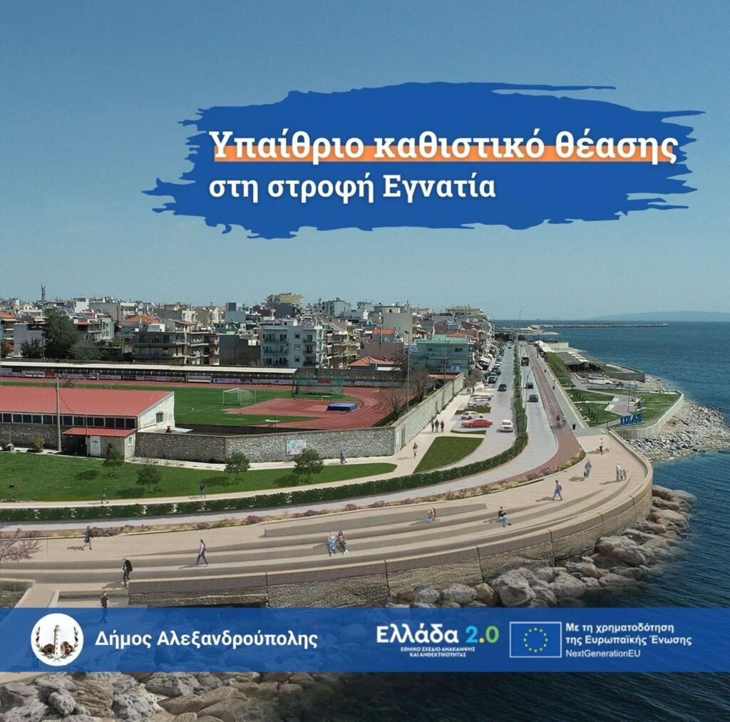 Στη Στροφή Εγνατία, ένα τοπόσημο του Δήμου μας, θα γίνει ένα πανέμορφο μπαλκόνι με κερκίδες, όπου θα είναι πλέον προσβάσιμο, θα μπορούμε να απολαμβάνουμε το Θρακικό Πέλαγος καθ’ όλη τη διάρκεια της ημέρας. Παραμένουν οι ποδηλατόδρομοι, παραμένουν τα πεζοδρόμια, γίνεται προσβάσιμο για όλους. Οι εργασίες θα ξεκινήσουν τις αμέσως επόμενες ημέρες. Ήδη έχει μπει εργοταξιακή σήμανση.