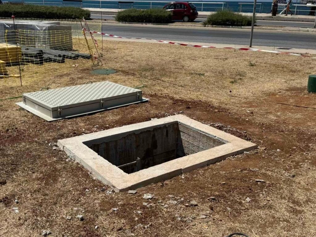 Αντικατάσταση οξειδομένων μεταλλικών καλυμμάτων φρεατίων του αντλιοστασίου με νέα κατασκευασμένα από αντιολισθητικό πάνελ χαμηλού βάρους και εξαιρετική αντοχή σε διαβρωτικούς παράγοντες και ειδικά ενισχυμένα για αντίσταση στην υπεριώδη ακτινοβολία (UV-resistant).
