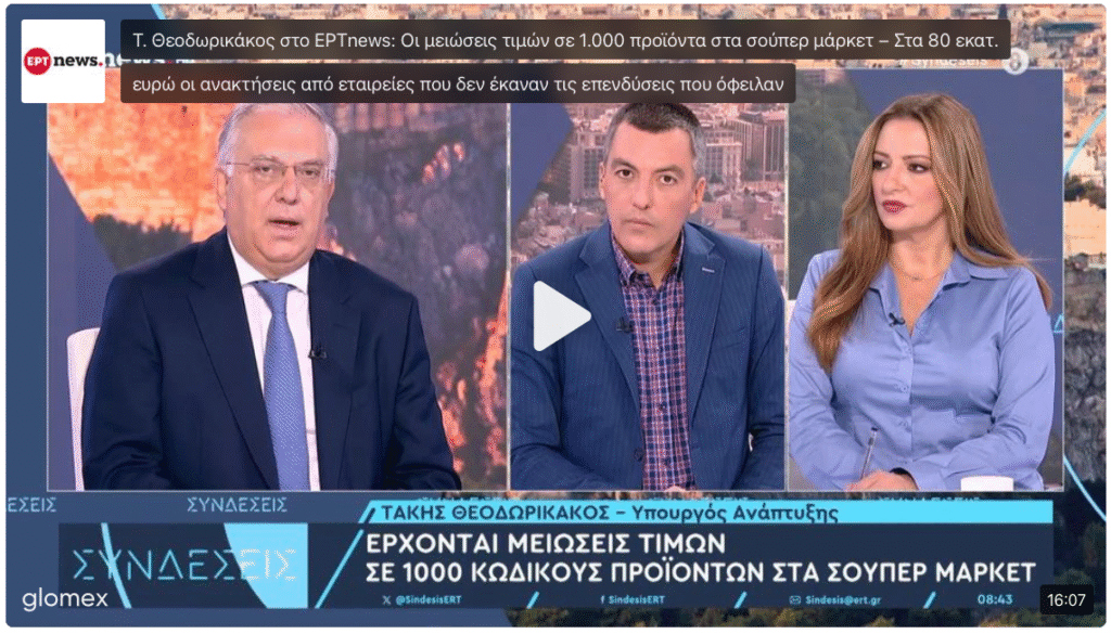 Στο ζήτημα της αντιμετώπισης της ακρίβειας και της μείωσης των τιμών στα βασικά αγαθά αναφέρθηκε ο υπουργός Ανάπτυξης, Τάκης Θεοδωρικάκος, μιλώντας στο ΕΡΤnews και την εκπομπή «Συνδέσεις». Ο υπουργός ανακοίνωσε πως, έπειτα από συμφωνία με τις μεγάλες αλυσίδες σούπερ-μάρκετ, οι τιμές σε τουλάχιστον 1.000 προϊόντα θα μειωθούν από το πρώτο δεκαπενθήμερο του Οκτωβρίου, με στόχο να διατηρηθούν χαμηλές και μετά τις γιορτές. Όπως υπογράμμισε, η κυβέρνηση δίνει «συνεχή μάχη» για τη συγκράτηση των τιμών, σημειώνοντας ότι η πρωτοβουλία αυτή αφορά είδη διατροφής, καθαριότητας και προσωπικής υγιεινής, με μείωση άνω του 5%. Ο κ. Θεοδωρικάκος ανέφερε ότι στο εγχείρημα συμμετέχει ενεργά και ο Σύνδεσμος Ελληνικών Βιομηχανιών Τροφίμων (ΣΕΒΤ). Παράλληλα, αναφέρθηκε στα πρόστιμα που έχουν επιβληθεί από τη ΔΙΜΕΑ σε μεγάλες αλυσίδες για παραβίαση του επιτρεπόμενου περιθωρίου κέρδους, ξεκαθαρίζοντας ότι «ο νόμος θα εφαρμόζεται για όλους, ανεξαρτήτως μεγέθους ή οικονομικής επιφάνειας».