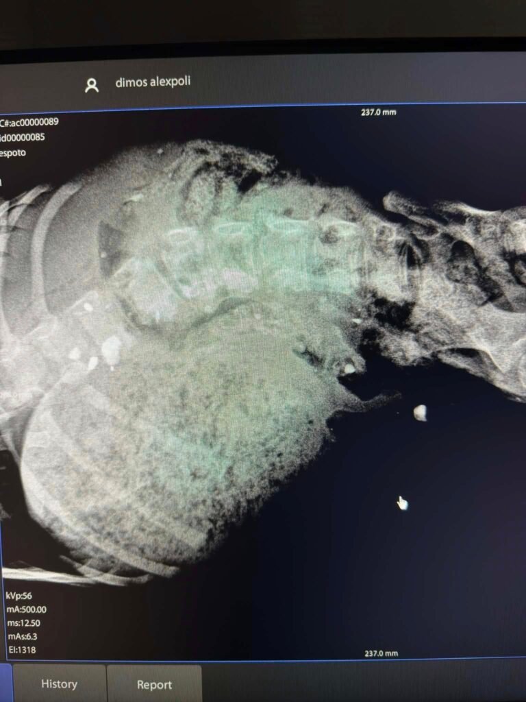 «Ήρθε στο κτηνιατρείο, αρχίσαμε την κλινική εξέταση. Φαινόταν ότι κάτι συνέβαινε στα πίσω άκρα και στη λεκάνη. Προχωρώντας, κάναμε ακτινογραφία και με τεράστια δυσάρεστη έκπληξη ανακαλύψαμε ότι το ζωάκι ήταν γεμάτο από μικρά σκάγια, προφανώς από πυροβόλο όπλο, και τώρα έγινε στόχος κάποιου διαστραμμένου για παιχνίδι, για εκτόνωση. Δεν μπορείς ποτέ να μπεις στο μυαλό ενός τέτοιου ανθρώπου, φυσικά. Κάποια σκάγια είναι σε μαλακά μόρια, σε μύες επιφανειακά. Αυτά αφαιρέθηκαν. Κάποια είναι πιο βαθιά, δεν έχουμε πρόσβαση. Δύο είναι δίπλα στο νωτιαίο μυελό και στη σπονδυλική στήλη. Δεν έχει διατομή, ευτυχώς, ο νωτιαίος μυελός.