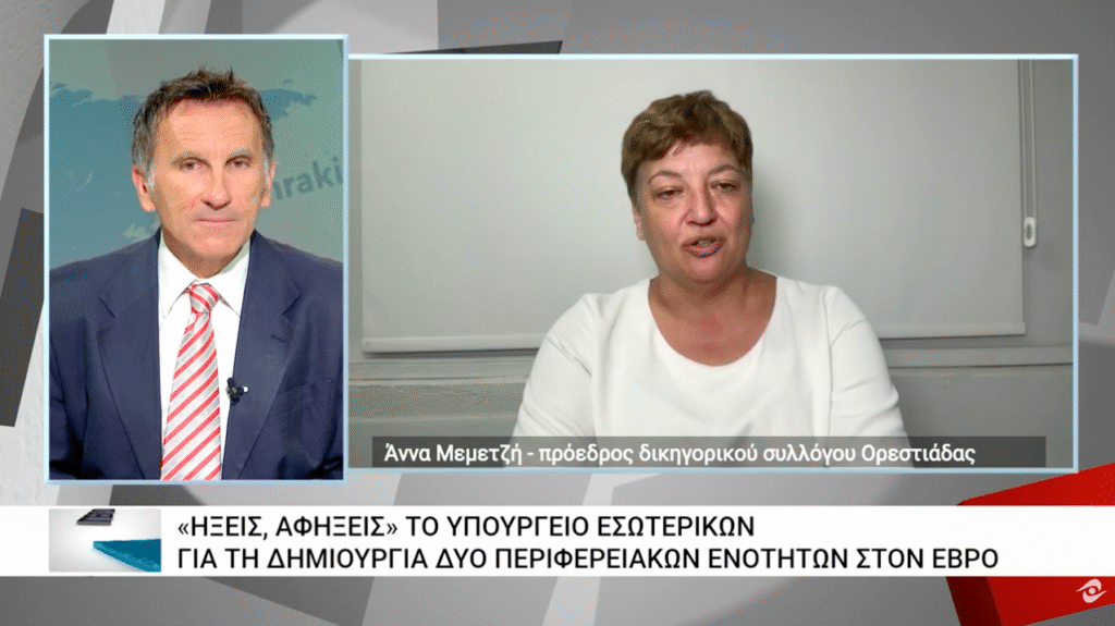 Τι δήλωσε στο ΘΡΑΚΗ ΝΕΤ, η πρόεδρος του Δικηγορικού Συλλόγου Ορεστιάδας, Άννα Μεμετζή – Αναγκαία η δημιουργία 2ης Περιφερειακής Ενότητας στον Έβρο – «Δεν πρόκειται για διχοτόμηση, αλλά για ουσιαστική διοικητική ενίσχυση»