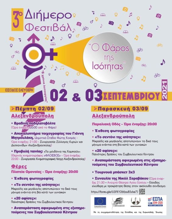 Στο πλαίσιο της προσπάθειας για την υπέρβαση κάθε μορφής έμφυλων ανισοτήτων, το Συμβουλευτικό Κέντρο Υποστήριξης Γυναικών-Θυμάτων Βίας του Δήμου Αλεξανδρούπολης διοργανώνει το 3οδιήμερο Φεστιβάλ «Ο Φάρος της Ισότητας» με ελεύθερη είσοδο για όλους και όλες, στις 2 & 3 Σεπτεμβρίου 2021. Φέτος για πρώτη φορά, και κατόπιν πρότασης του Δημάρχου Αλεξανδρούπολης κου Ιωάννη Ζαμπούκη, η καρδιά του Φεστιβάλ θα χτυπάει τόσο στην Αλεξανδρούπολη όσο και στις Φέρες όπου και θα πραγματοποιηθούν παράλληλες δράσεις (2/9).