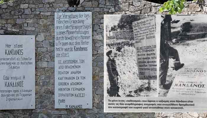 Hπρώτη αναφέρει: «Δια την κτηνώδη δολοφονίαν Γερμανών αλεξιπτωτιστών, αλπινιστών και του μηχανικού από άνδρας, γυναίκας και παιδιά και παπάδες μαζiκαι διότι ετόλμησαν να αντισταθούν κατά του μεγάλου Ράιχ, κατεστράφη την 3-6-1941 η Κάνδανος εκ θεμελίων, διά να μην επαναοικοδομηθεί πλέον ποτέ».