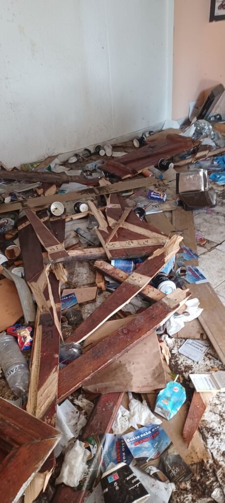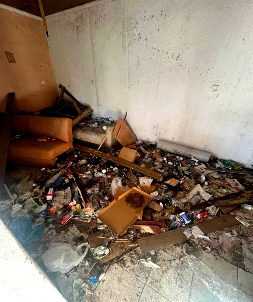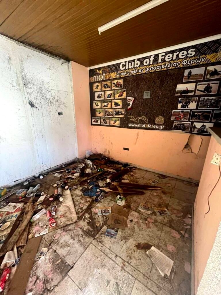Ακόμη πιο αποκαρδιωτική είναι η εικόνα στον χώρο, όπου παλαιότερα στεγαζόταν ο Όμιλος Φίλων Μοτοσικλέτας Φερών. Εκεί, αλουμινένια μπουκάλια, πλαστικά ποτήρια, σακούλες, εφημερίδες, ξύλα και παλιά έπιπλα συνθέτουν ένα σκηνικό έντονης βρωμιάς.