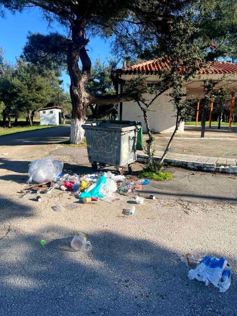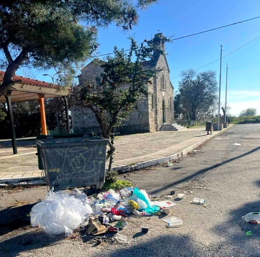 Οι εικόνες καταγράφουν μια τραγική κατάσταση: σκουπίδια πεταμένα περιμετρικά της εκκλησίας, παρά την ύπαρξη κάδων, ενώ ένας ολόκληρος κάδος απορριμμάτων εντοπίζεται πεταμένος στα βράχια.