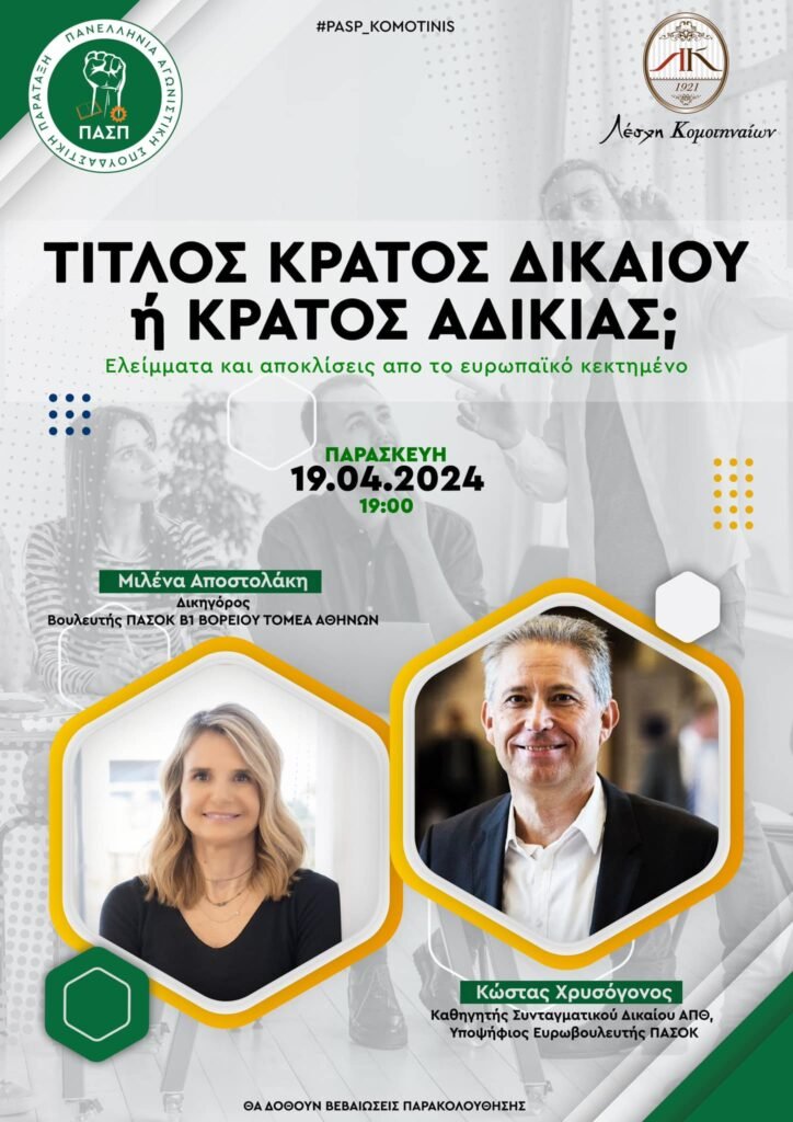 Το θέμα της εκδήλωσης είναι «Κράτος Δικαίου ή Κράτος αδικίας; Ελλείμματα και αποκλίσεις από το ευρωπαϊκό κεκτημένο».