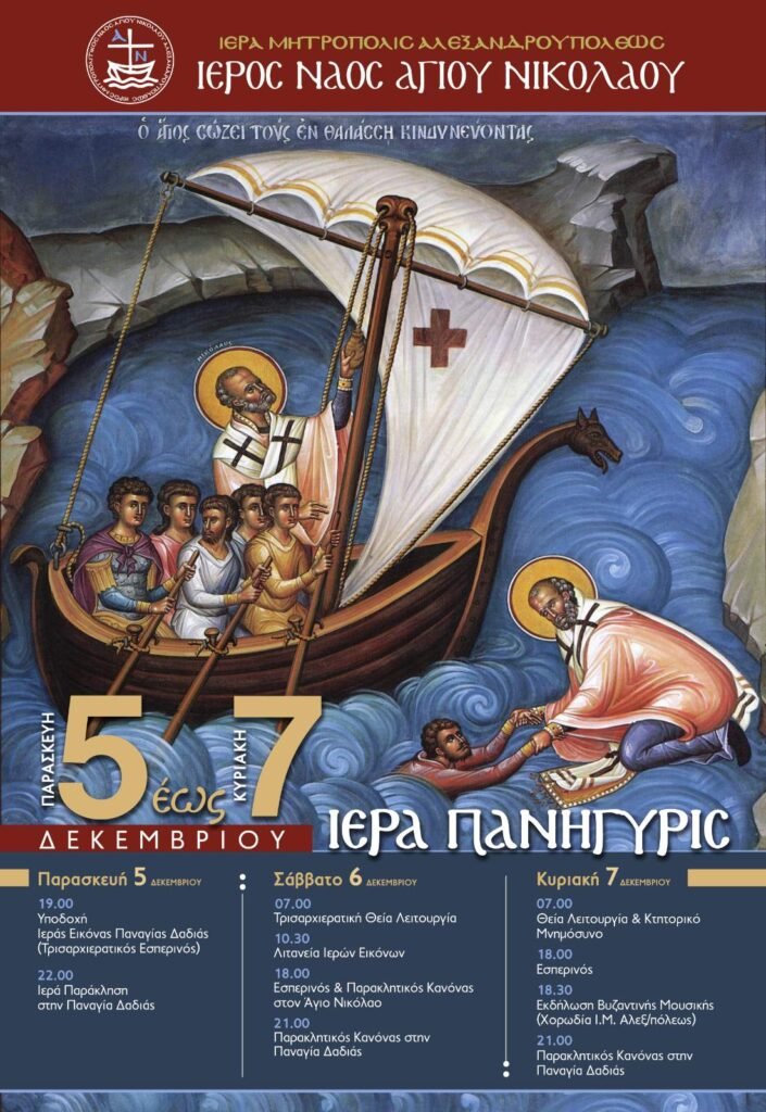 Το Σάββατο 6 Δεκεμβρίου 2025, η Εκκλησία εορτάζει την μνήμη του αγίου Νικολάου, Αρχιεπισκόπου Μύρων της Λυκίας, του πολιούχου της Αλεξανδρουπόλεως και πανηγυρίζει ο Ιερός Μητροπολιτικός Ναός της πόλεώς μας.