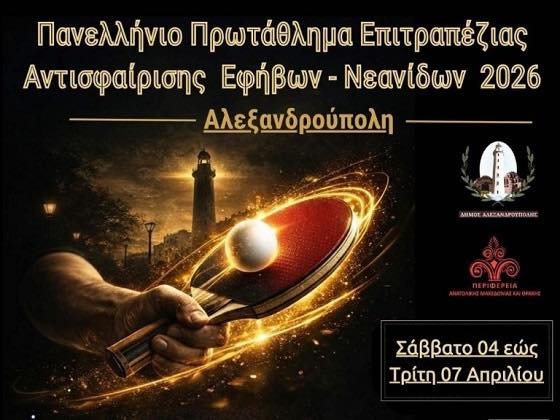 Η Αλεξανδρούπολη επιβεβαιώνει τη δυναμική της παρουσία στον αθλητικό χάρτη της χώρας, αναλαμβάνοντας τη διοργάνωση του Πανελληνίου Πρωταθλήματος Επιτραπέζιας Αντισφαίρισης Εφήβων – Νεανίδων. Από το Σάββατο 4 έως και τη Μεγάλη Τρίτη 7 Απριλίου 2026, το Κλειστό Γυμναστήριο «Μιχάλης Παρασκευόπουλος» θα μετατραπεί στην «έδρα» του εγχώριου Ping Pong.