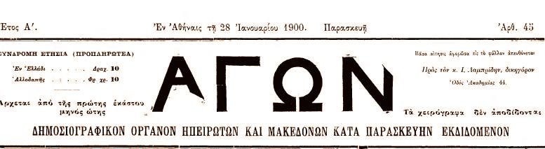 1. Εφημερίδα ΑΓΩΝφύλλο της28ης Ιανουαρίου 1900
