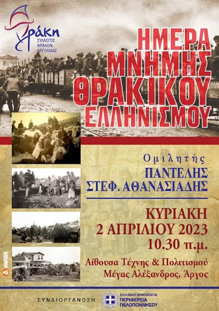 Την εκδήλωση οργάνωσε ο δραστήριος  σύλλογος Θρακών Αργολίδας «Η Θράκη» με συνδιοργανωτή την Περιφέρεια Πελοποννήσου. Η εκδήλωση έγινε στην αίθουσα «Μέγας Αλέξανδρος» και παρέστησαν οι βουλευτές Αργολίδας Ιωάννης Αδριανός (ΝΔ) και Ανδρέας Πουλάς (ΠΑΣΟΚ/ΚΙΝΑΛ) ο πρόεδρος του Περιφερειακού Συμβουλίου Πελοποννήσου Ιωάννης Μαλτέζος (με ρίζες από τα Μάλγαρα Ανατολικής Θράκης) εκπρόσωποι του Δήμου Άργους και Θρακιώτες που κατοικούν στο νομό Αργολίδος και πολλοί φίλοι της Θράκης.