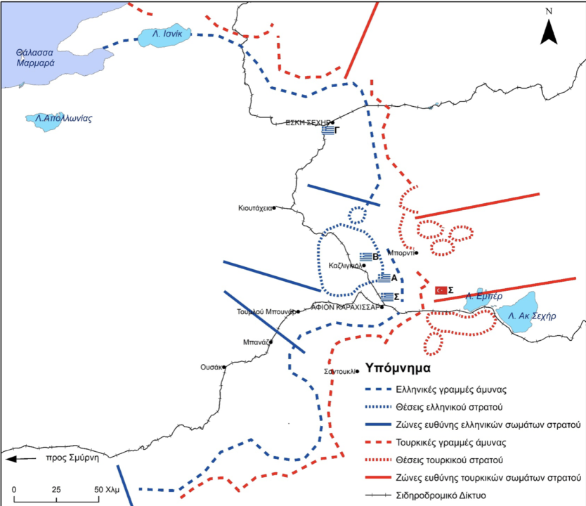 Το πιο ασθενές σημείο της Ελληνικής άμυνας ήταν η περιοχή νοτιοδυτικά του Αφιόν. Αυτή εκαλύπτετο μόνο από την Iκαι IVΜεραρχία σε ένα μέτωπο 150 χλμ.!!!