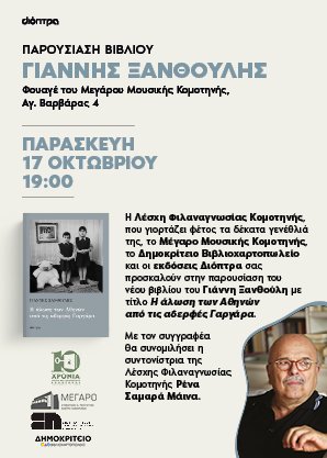 Η Λέσχη Φιλαναγνωσίας Κομοτηνής, που γιορτάζει φέτος τα δέκατα γενέθλιά της, το Μέγαρο Μουσικής Κομοτηνής, το Δημοκρίτειο Βιβλιοχαρτοπωλείο και οι εκδόσεις Διόπτρα σας προσκαλούν στην παρουσίαση του νέου βιβλίου του Γιάννη Ξανθούλη με τίτλο Η άλωση των Αθηνών από τις αδερφές Γαργάρα.