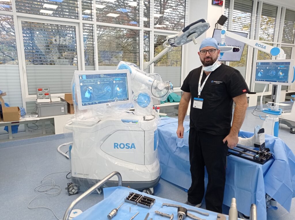 Η αιχμή του δόρατος στην αρθροπλαστική του γόνατος είναι η ρομποτική αρθροπλαστική. Η χρήση της ρομποτικής τεχνολογίας επιτρέπει την ακριβή και ασφαλή διεξαγωγή της επέμβασης με στόχο την ελάττωση του μετεγχειρητικού πόνου, την μακροβιότητα της αρθροπλαστικής και τη διατήρηση της φυσικότητας της άρθρωσης σε σύγκριση με την κλασική μέθοδο. Το ρομποτικό σύστημα διαβάζει και αναλύει χιλιάδες παραμέτρους μέσα στο χειρουργείο και ο βραχίονας του ρομπότ αποτελεί την προέκταση του χεριού του χειρουργού, με αποτέλεσμα να εκτελούνται όλοι οι χειρισμοί με τεράστια ακρίβεια και ασφάλεια. Αυτό το γεγονός προσφέρει άριστη τοποθέτηση των προθέσεων, ελάχιστη απώλεια αίματος, μηδενική κακοποίηση των γύρω ιστών και τελικά άριστη ικανοποίηση του ασθενή, οποίος επανέρχεται στην καθημερινότητά του πολύ σύντομα.