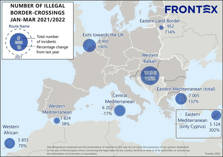 Μεγάλη αύξηση παράνομων μεταναστών παρατηρείται επίσης στην Κύπρο με ποσοστό 302%, 5.124 σύνολο κατά τον Ιανουάριο, Φεβρουάριο και Μάρτιο 2022 σε σχέση με την αντίστοιχη του 2021.