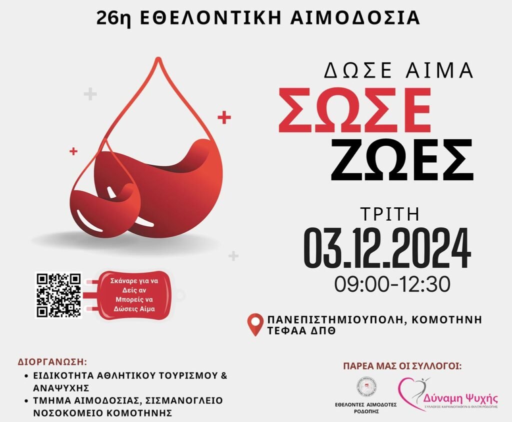 Η εκδήλωση, όπως κάθε χρόνο, πραγματοποιείται χάρη στην εθελοντική συνεισφορά και αγόγγυστη προσπάθεια των φοιτητών/τριών της Ειδικότητας Αθλητικού Τουρισμού & Αναψυχής αλλά και χάρη στην ευσυνειδησία και το κέφι των ιατρών και νοσηλευτών του Τμήματος Αιμοδοσίας του Σισμανογλείου Νοσοκομείου Κομοτηνής.