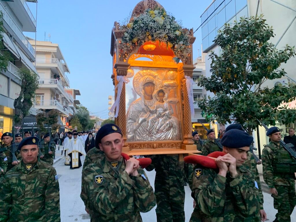 Συνοδεία στρατιωτικής μουσικής, στρατιωτικού αγήματος και μελών πολιτιστικών συλλόγων του Έβρου, η πομπή διάνυσε την μικρή απόσταση ως την ειδική εξέδρα όπου τοποθετήθηκε η εικόνα της Παναγίας Τριφώτισσας.