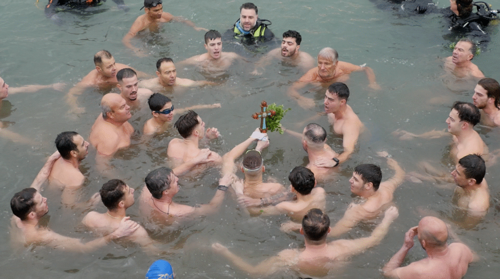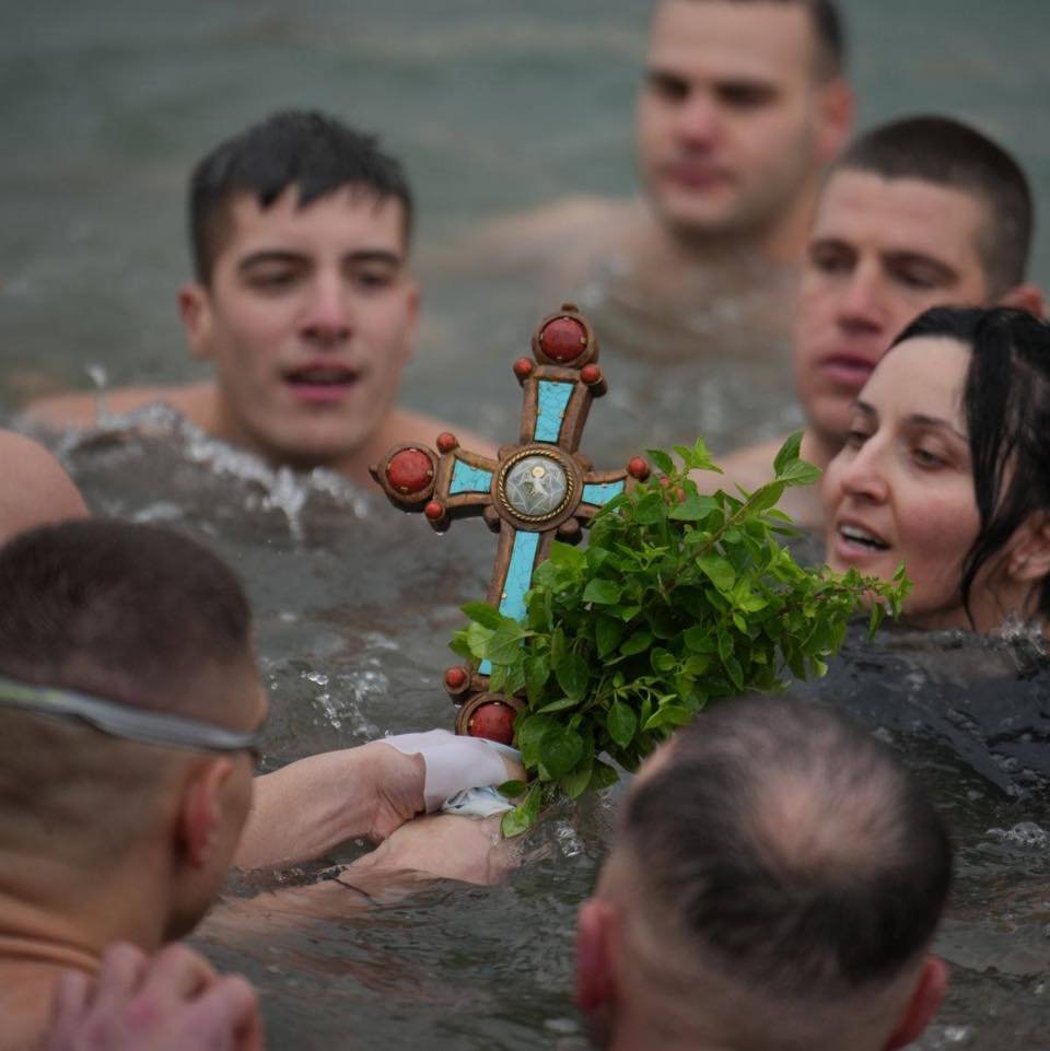 Σε βίντεο που κυκλοφορεί στα μέσα κοινωνικής δικτύωσης, οι πιστοί που βούτηξαν στα παγωμένα νερά του ποταμού Σακουλέβα για να ανασύρουν τον Τίμιο Σταυρό φαίνονται να σπρώχνονται έντονα, καθώς ο καθένας προσπαθεί να κρατήσει το ιερό αντικείμενο.
