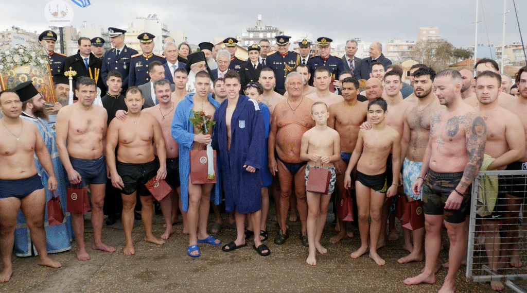 Συγκινητική και ιδιαίτερη ήταν η στιγμή στο τέλος της τελετής, όταν όλοι οι πιστοί που βούτηξαν για τον Σταυρό, έψαλαν μαζί και αγκαλιασμένοι τον Εθνικό Ύμνο.