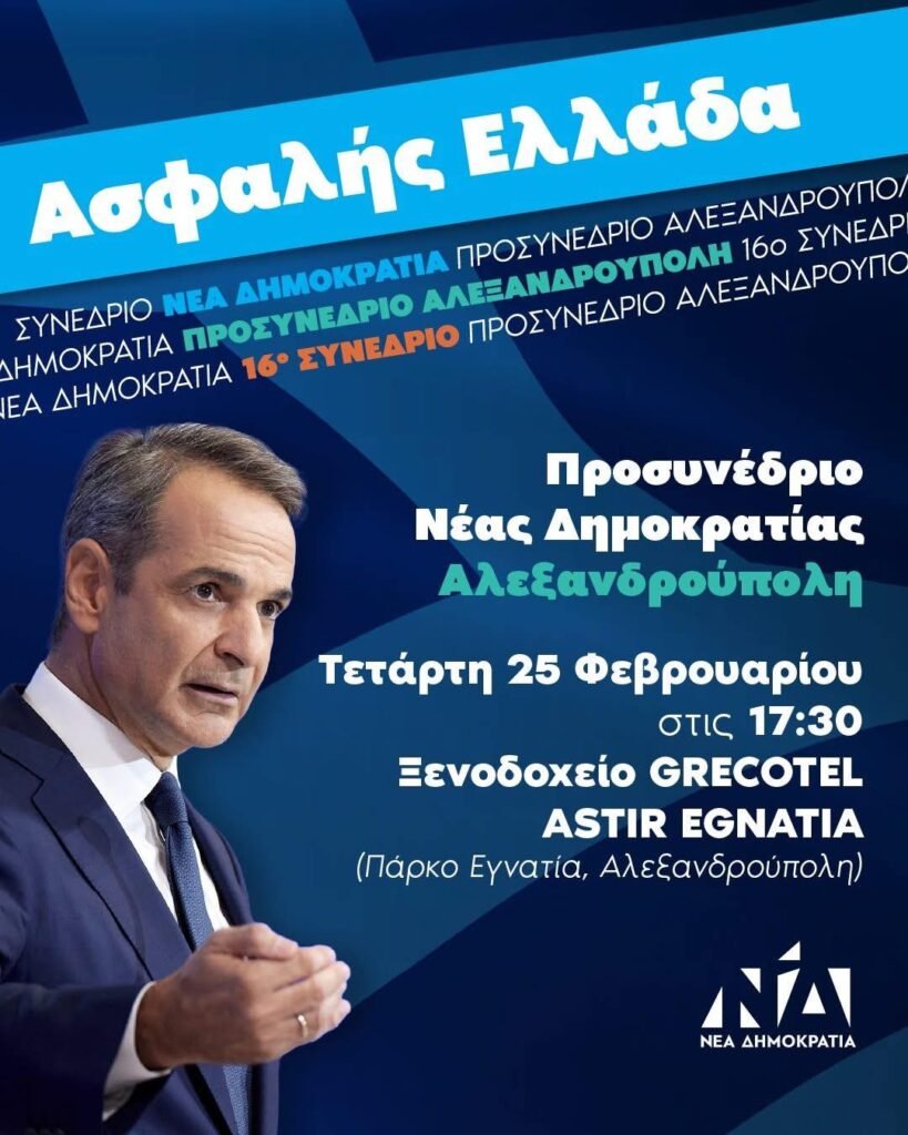 Το περιφερειακό προσυνέδριο με τίτλο «Ασφαλής Ελλάδα» θα πραγματοποιηθεί στην πρωτεύουσα του Έβρου, όπως έχει ήδη ανακοινωθεί επισήμως, με τον Πρωθυπουργό να απευθύνει ομιλία που θα επικεντρώνεται πιθανότατα σε θέματα ασφάλειας, περιφερειακής ανάπτυξης και διασυνοριακής συνεργασίας.
