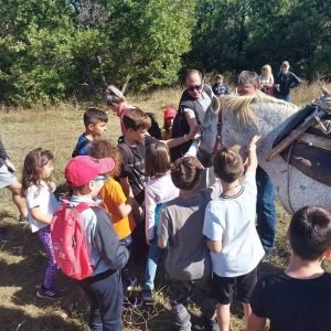 Η δίψα για γνώση έσβησε γλυκά με τα χάδια και τις βόλτες των μικρών πεζοπόρων πάνω στα άλογα εργασίας που βρισκόταν 1 χιλιόμετρο πιο πέρα από τις ανεμογεννήτριες. Εκεί ο Βασίλης Σισμανίδηw, πρόεδρος του δασικού συνεταιρισμού της Αισύμης, ενημέρωσε τους πεζοπόρους του ΔΡΟΜΕΑ,  για τον τρόπο εργασίας, τη διαδικασία μεταφοράς των ξύλων, την φροντίδα των αλόγων αλλά και για την σπουδαιότητα της συνεργασίας μεταξύ ζώων και ανθρώπου μέσα στο βάθος των χρόνων. Τα παιδιά απόλαυσαν την ζεστασιά που αποπνέουν τα ζώα αυτά και που η άμεση επαφή μαζί τους μπορεί κάτω από συγκεκριμένες συνθήκες να λειτουργήσει θεραπευτικά σε ψυχικό και πνευματικό επίπεδο, σύμφωνα με τα λεγόμενα της Διαλεχτής Πετρίδου, ιδιοκτήτριας τους ενός, από τα άλογα της παρέας.
