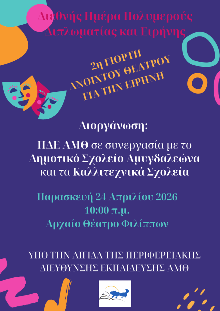 Με ιδιαίτερη επιτυχία πραγματοποιήθηκε την Παρασκευή 24 Απριλίου 2026, στο Αρχαίο Θέατρο Φιλίππων, η εκδήλωση «2η Γιορτή Ανοιχτού Θεάτρου για την Ειρήνη», που διοργάνωσε η Περιφερειακή Διεύθυνση Εκπαίδευσης Ανατολικής Μακεδονίας και Θράκης στο πλαίσιο της Διεθνής Ημέρα Πολυμερούς Διπλωματίας και Ειρήνης.