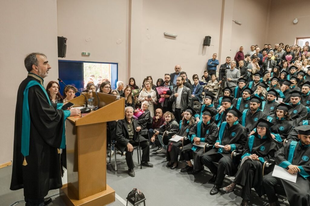 Στη συνέχεια, ο Αντιπρύτανης Έρευνας και Καινοτομίας του ΔΠΘ και Καθηγητής του Τμήματος Αγροτικής Ανάπτυξης κ. Γιώργος Μπρούφας απηύθυνε χαιρετισμό μεταφέροντας τις ευχές της Πρυτανείας του ΔΠΘ στις νέες και στους νέους πτυχιούχους. Υπογράμμισε τη θεμελιώδη σημασία της πανεπιστημιακής εκπαίδευσης σε μια κοινωνία και οικονομία που μετασχηματίζονται, καλώντας τις/τους αποφοίτους του Τμήματος να αξιοποιήσουν τις γνώσεις τους και να υπερασπιστούν την ακαδημαϊκή δεοντολογία σε κάθε στάδιο της επαγγελματικής τους πορείας.