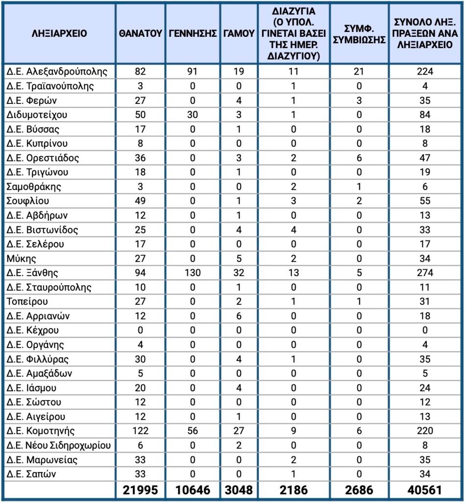 Στις Δ.Ε. Τραϊανούπολης, Φερών, Βύσσας, Κυπρίνου, Ορεστιάδος, Τριγώνου, Σαμοθράκης και Σουφλίου δεν έγινε καμία γέννηση, σε αντίθεση με τους θανάτους.