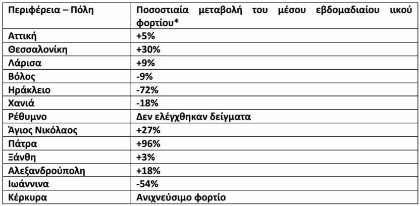 Καθαρή αύξηση του μέσου εβδομαδιαίου ιικού φορτίου παρατηρήθηκε στην Πάτρα (+96%), ενώ οριακές ήταν οι αυξήσεις στην Αλεξανδρούπολη (+18%), στον Άγιο Νικόλαο (+27%) και στη Θεσσαλονίκη (+30%).