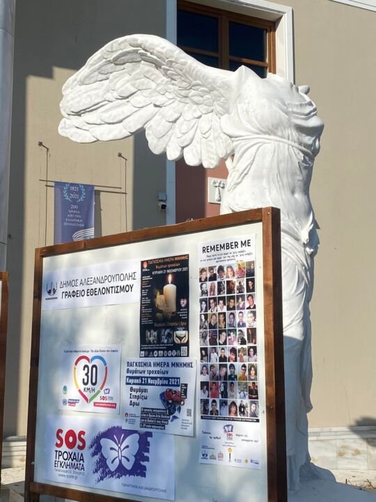 Με αφορμή την Παγκόσμια Ημέρα Μνήμης Θυμάτων Τροχαίων Δυστυχημάτων που έχει θεσπιστεί να τιμάται την 3η Κυριακή κάθε Νοεμβρίου, ο Δήμος Αλεξανδρούπολης συμμετέχει στην εκστρατεία του Παγκόσμιου Οργανισμού Υγείας και του Οργανισμού Ηνωμένων Εθνών σύμφωνα με το νέο παγκόσμιο πλάνο δράσης 2021-2030 για την μείωση των τροχαίων συγκρούσεων, με την ενημέρωση και την κοινωνική ευαισθητοποίηση των πολιτών στο μείζον παγκόσμιο ζήτημα της Οδικής Ασφάλειας και των Θυμάτων Τροχαίων.