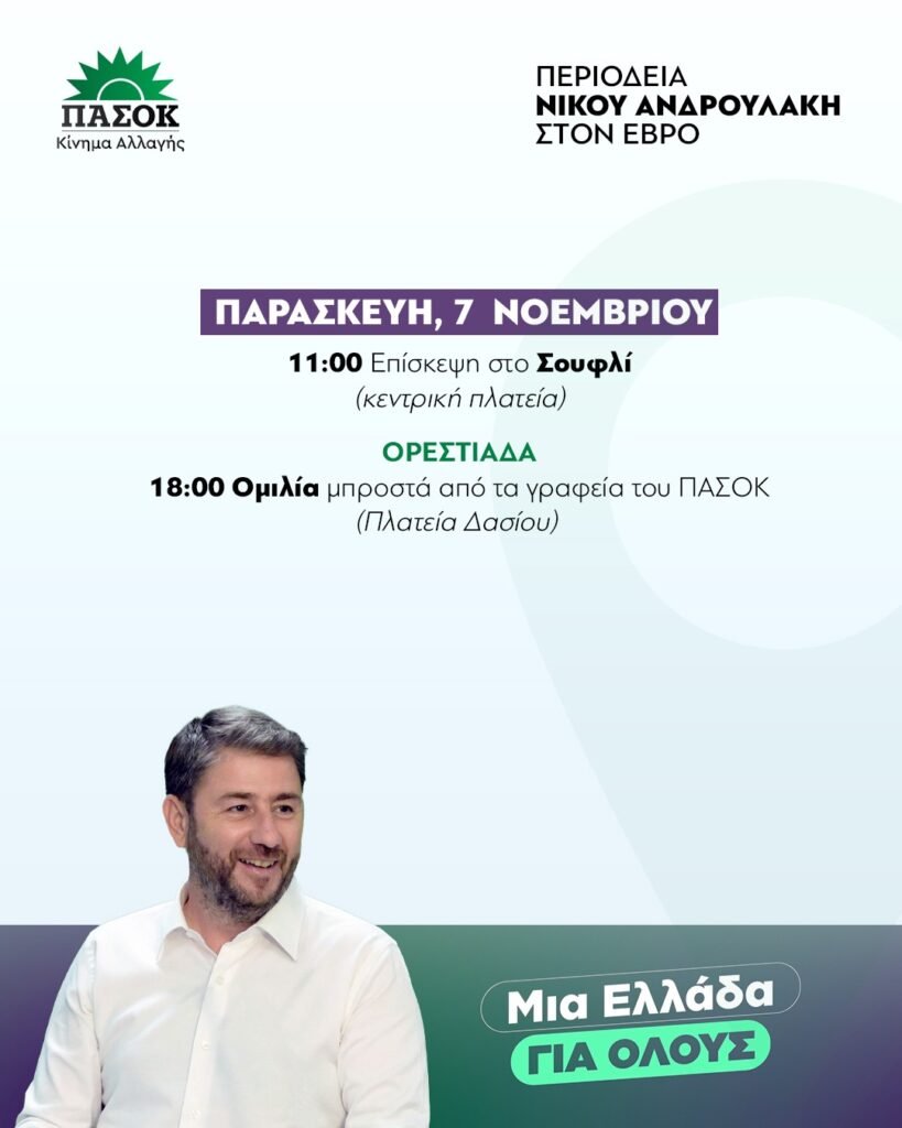 Ειδικότερα, ο Πρόεδρος του ΠΑΣΟΚ-Κινήματος Αλλαγής, συνοδευόμενος από και μέλη της Κ.Π.Ε. της Ν.Ε. και στελεχών του ΠΑΣΟΚ-Κινήματος Αλλαγής, θα πραγματοποιήσουν Περιοδεία στον Νομό Έβρου, σήμερα Παρασκευή 7 Νοεμβρίου 2025.