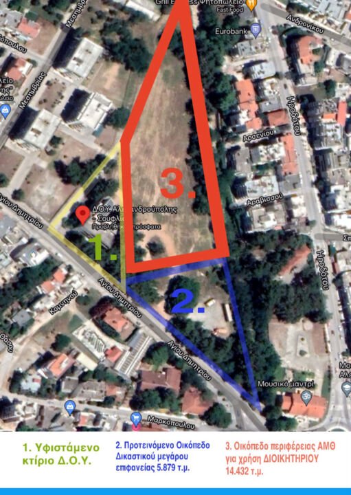 Τόσο με την θεσμική όσο και με την επιστημονική μου ιδιότητα, σας δηλώνω πως υπάρχει ο κατάλληλος δημόσιος χώρος, ένα οικόπεδο έκτασης 5.879,00 τ.μ. (συνημμένο χάρτης) με πρόσωπο στην οδό Αγίου Δημητρίου, το οποίο μπορεί να αποτελέσει μια εξαιρετική πρόταση για την χωροθέτηση ενός Νέου Δικαστικού μεγάρου. Το γεγονός μάλιστα πως γειτνιάζει με το οικόπεδο στο οποίο βρίσκεται το κτίριο της Δ.Ο.Υ Αλεξανδρούπολης, αλλά και με το οικόπεδο των 14.432 τ.μ. το οποίο έχει παραχωρηθεί στην περιφέρεια για την δημιουργία ενός Διοικητηρίου, ενισχύει τα επιχειρήματα για την καταλληλότητα του συγκεκριμένου χώρου. Τέλος οφείλω να σημειώσω πως δεν υπάρχει κανένας λόγος ανησυχίας για την κοπή των δέντρων που υπάρχουν μέσα στο οικόπεδο, διότι υπάρχει ικανή ελεύθερη επιφάνεια για την κτιριακή εγκατάσταση.