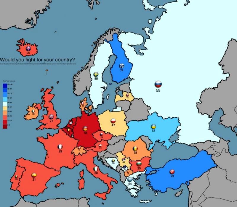 Οι πολίτες δεκάδων χωρών της Ευρώπης απαντούν στο κατά πόσο θα πολεμούσαν για την πατρίδα τους, σε έρευνας που διενήργησε η Gallup International και στον χάρτη  αποτυπώνονται τα αποτελέσματα της έρευνας. Σε κάθε χώρα αναγράφεται το ποσοστό αυτών που δήλωσαν πρόθυμοι να πολεμήσουν για τη χώρα τους.