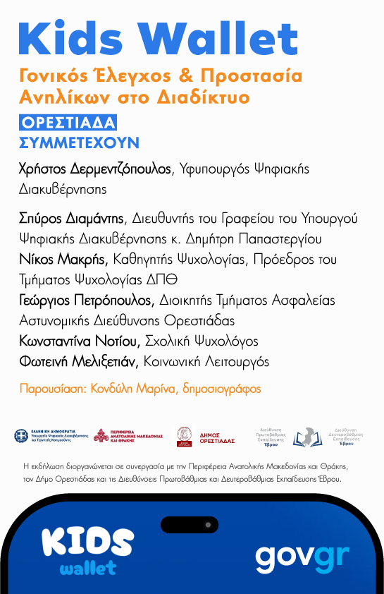 Ο Υφυπουργός Ψηφιακής Διακυβέρνησης, Χρήστος Δερμεντζόπουλος σε συνεργασία με την Περιφέρεια Ανατολικής Μακεδονίας και Θράκης, τον Δήμο Αλεξανδρούπολης, τον Δήμο Νέας Ορεστιάδας και τις Διευθύνσεις Πρωτοβάθμιας και Δευτεροβάθμιας Εκπαίδευσης Έβρου διοργανώνουν δύο εκδηλώσεις με θέμα «Kids Wallet: Γονικός έλεγχος & Προστασία Ανηλίκων στο Διαδίκτυο.», οι οποίες θα πραγματοποιηθούν: