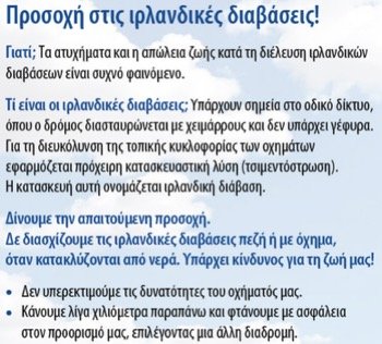 Οι ιρλανδικές διαβάσεις είναι σημεία όπου ο δρόμος διασταυρώνει ξεροπόταμο ή ρέμα και το πέρασμα είναι επιτρεπτό υπό φυσιολογικές συνθήκες. Ωστόσο, η αυξημένη ροή νερού μετά από έντονες βροχοπτώσεις μπορεί να μετατρέψει αυτές τις διαβάσεις σε επικίνδυνα σημεία, με κίνδυνο παράσυρσης οχημάτων και πεζών.