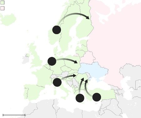 Πρόκειται για διαδρόμους από τους οποίους θα μεταφερθούν τα αμερικανικά στρατεύματα και θα προμηθευτούν οι δυτικές δυνάμεις απαραίτητα εφόδια «για να σταματήσουν μία μεγάλη ρωσική επίθεση», αλλά στην πραγματικότητα ο πραγματικός στόχος είναι πλέον η εισβολή στην ίδια την Ρωσία με ότι αυτό συνεπάγεται.