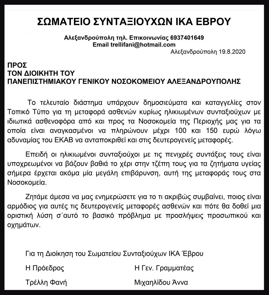Την επιστολή του Σωματείου Συνταξιούχων ΙΚΑ Έβρου σύμφωνα με την οποία υπάρχουν καταγγελίες και δημοσιεύματα για τη μεταφορά ασθενών, κυρίως ηλικιωμένων συνταξιούχων, με ιδιωτικά ασθενοφόρα «από και προς τα Νοσοκομεία της περιοχής μας», κατέθεσε ως Αναφορά η Βουλευτής Έβρου του ΣΥΡΙΖΑ, Νατάσα Γκαρά.