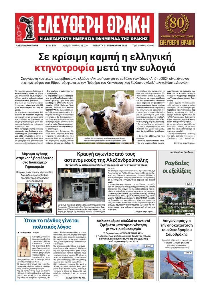 Τι δήλωσε στην «ΕΛΕΥΘΕΡΗ ΘΡΑΚΗ» ο Πρόεδρος του Μελισσοκομικού Συλλόγου Έβρου, Γιάννης Καλογιαντσίδης, για τις αποζημιώσεις από τις πυρκαγιές του 2023 Στην...