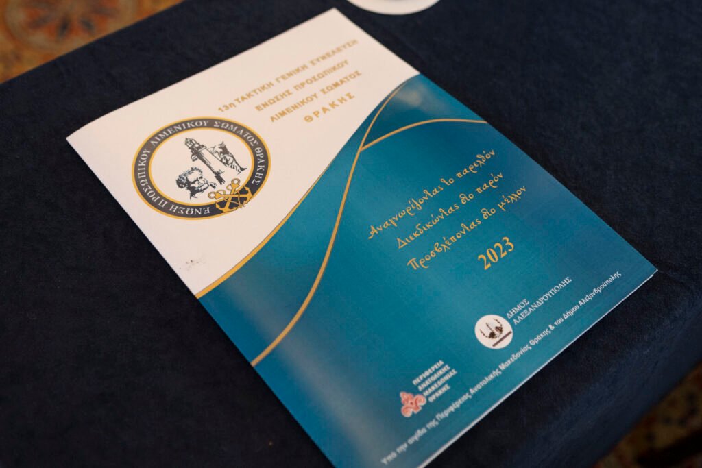 Στην Αλεξανδρούπολη το Σάββατο, 02-12-2023, πραγματοποιήθηκε η 13η Τακτική Γενική Συνέλευσης της Ένωσης Προσωπικού Λιμενικού Σώματος Θράκης, υπό την αιγίδα της Περιφέρειας Ανατολικής Μακεδονίας και Θράκης και του Δήμου Αλεξανδρούπολης, παρουσία της Πανελλήνιας Ομοσπονδίας Ενώσεων Προσωπικού Λιμενικού Σώματος, υπό τον Πρόεδρο κ. Τσιάνο Παναγιώτη, τον Γενικό Γραμματέα κ. Δροσόπουλο Αλέκο, τον Αντιπρόεδρο κ. Σφακιανάκη Γεώργιο, τον Ταμία κ. Γαλάνη Χρήστο και τον Υπεύθυνο Δημοσίων Σχέσεων κ. Ζυγούρη Νικόλαο.
