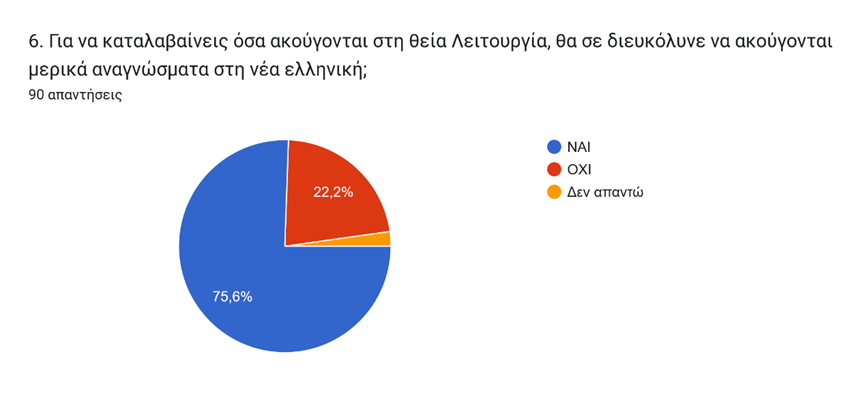 Όπως αναφέρθηκε, η συγκεκριμένη Θεία Λειτουργία τελέσθηκε με ανάγνωση των περισσότερων κειμένων στη δημοτική γλώσσα, κάτι που όπως προκύπτει από τα αποτελέσματα (γράφημα 6) θα διευκόλυνε το 75,6% των νέων, οι οποίοι αγγίζουν το 90% όταν καλούνται να απαντήσουν αν θα ήθελαν να γίνεται συχνότερα ο σχολικός εκκλησιασμός με τον συγκεκριμένο τρόπο (γράφημα 7).