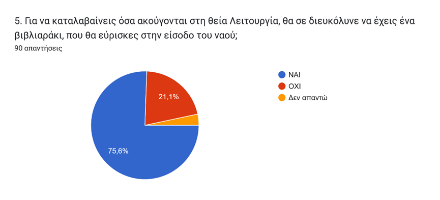 Σημαντικό θα ήταν επίσης για τους μαθητές (75,6% στο γράφημα 5) να υπήρχε ένα βιβλιαράκι στην είσοδο του Ναού, ώστε να γίνεται κατανοητά όσα ακούγονται στη Θεία Λειτουργία, την οποία ένα ποσοστό της τάξεως του 40% παρακολουθεί κάθε Κυριακή (γράφημα 2).