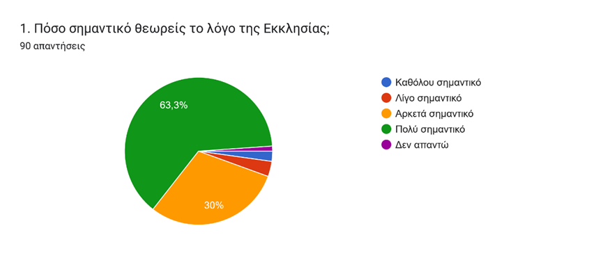 Σύμφωνα με την καταγραφή των απαντήσεων όπως αποτυπώνονται στο πρώτο γράφημα, 9 στους 10 μαθητές και μαθήτριες, θεωρούν τον λόγο τη Εκκλησίας πολύ σημαντικό/αρκετά σημαντικό. Πρόκειται για μία διαπίστωση της εμπιστοσύνης  που δείχνουν οι μαθητές προς την Εκκλησία, παρ’ όλο που ένας/μία στους δύο (γράφημα 3)δυσκολεύεται με την χρήση της αρχαίας γλώσσας στα κείμενα της Εκκλησίας, την ίδια στιγμή που είναι μεγάλο το ποσοστό (περίπου 7 στους 10) εκείνων που δεν δυσκολεύονται από την χρονική διάρκεια των Ακολουθιών (γράφημα 4).