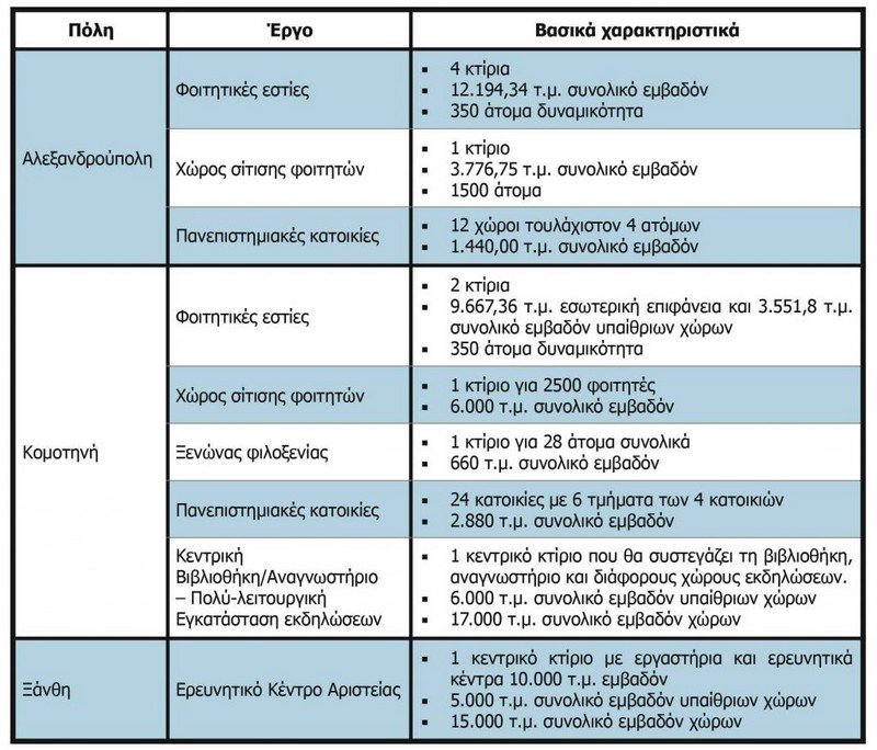 Και άλλων βοηθητικών κτιρίων, στις Πανεπιστημιουπόλεις Αλεξανδρούπολης, Κομοτηνής και Ξάνθης, κόστους 105.500.000 ευρώ