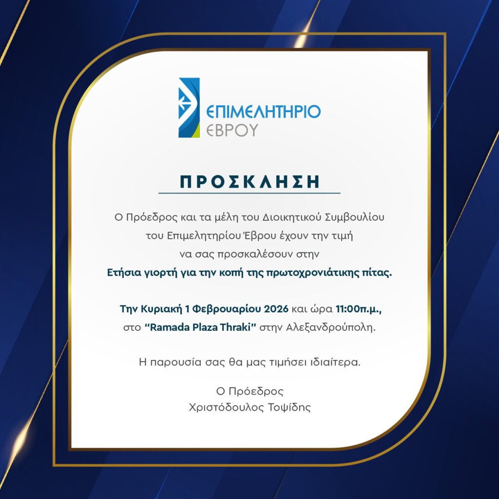 Κανονικά θα διεξαχθεί η καθιερωμένη εκδήλωση για την κοπή της πρωτοχρονιάτικης πίτας του Επιμελητηρίου Έβρου, που είναι προγραμματισμένη να γίνει την προσεχή Κυριακή 1η Φεβρουαρίου 2026, στις 11:00 στο ξενοδοχείο «RamadaPlaza Thraki», στην Αλεξανδρούπολη.