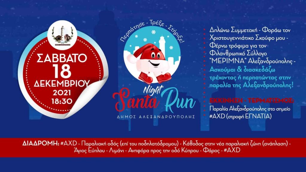 Μετά το 1οδιαδικτυακό (λόγω των αυστηρών υγειονομικών πρωτοκόλλων) SantaRunπου πραγματοποιήθηκε πέρυσι, ο Δήμος Αλεξανδρούπολης καλεί μικρούς και μεγάλους να συμμετάσχουν στο NightSantaRun, το Σάββατο 18 Δεκεμβρίου 2021, ώρα 18.30 με σημείο εκκίνησης το selfiepoint#AXDστην παραλιακή λεωφόρο.