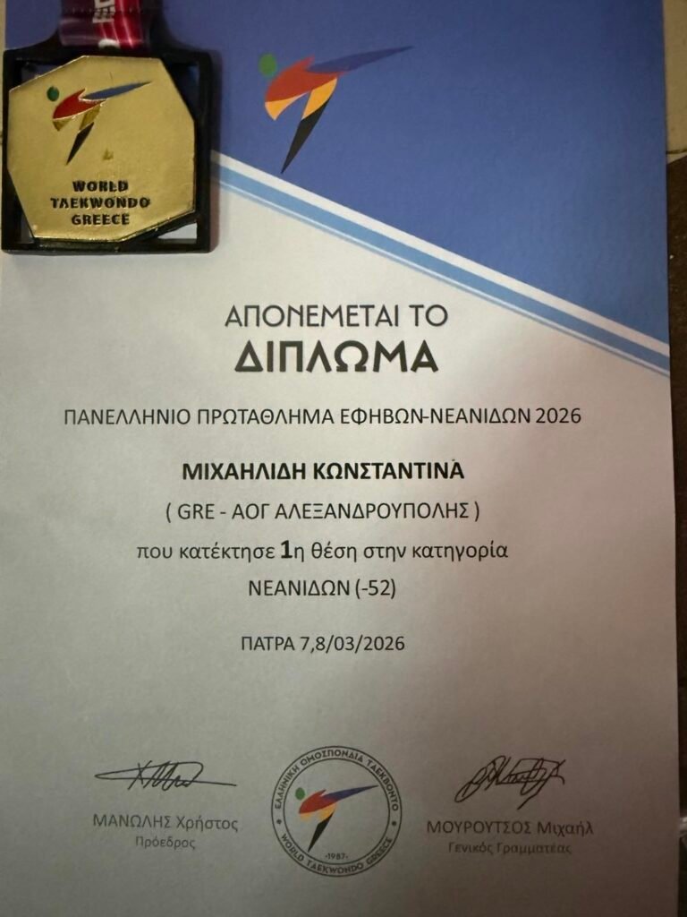 Η 16χρονη Κωνσταντίνα Μιχαηλίδη, από τις Φέρες και μέλος του ΑΟΓ Αλεξανδρούπολης, κατέκτησε το χρυσό μετάλλιο στην κατηγορία -52 κιλά, σημειώνοντας τέσσερις εντυπωσιακές νίκες και εξασφαλίζοντας παράλληλα μοριοδότηση για την τριτοβάθμια εκπαίδευση.