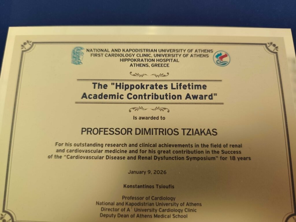 Ο Διευθυντής της Α’ Πανεπιστημιακής Καρδιολογικής Κλινικής, Καθηγητής Καρδιολογίας ΕΚΠΑ και αντιπρόεδρος της Ιατρικής Σχολής του ΕΚΠΑ, Δρ. Κωνσταντίνος Τσιούφης αναγνωρίζοντας την επίπτωση του ερευνητικού έργου του Καθηγητή Δρ. Τζιακά στην εξέλιξη της Καρδιαγγειακής Ιατρικής ιδιαίτερα στον τομέα του ΚαρδιοΝεφρικού Συνδρόμου καθώς και τα εξαιρετικά του επιτεύγματα στον εκσυγχρονισμό αλλά και στην εφαρμογή σύγχρονων μεθόδων επεμβατικής Καρδιολογίας από την Πανεπιστημιακή Καρδιολογική Κλινική του ΠΓΝ Αλεξανδρούπολης στην καθημερινή κλινική πρακτική, του απένειμε το Βραβείο Αριστείας. «TheHippokratesLifetimeAcademicContributionAward” σε μια τελετή Βράβευσης, στο Ευγενίδειο Ίδρυμα Αθηνών, κατά την τελετή έναρξης του 18ου Πανελλήνιου Συμποσίου Καρδιαγγειακές Παθήσεις και Νεφρική Δυσλειτουργία, 8-10 Ιανουαρίου 2026, Αθήνα.