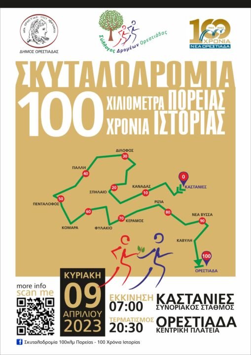 Η Οργανωτική επιτροπή των 100 χρόνων του Δήμου Ορεστιάδας και ο Σύλλογος Δρομέων Ορεστιάδας διοργανώνουν σκυταλοδρομία μήκους 100 χιλιομέτρων στο πλαίσιο εορτασμού των 100 χρόνων από την ίδρυση της πόλης. Η σκυταλοδρομία θα πραγματοποιηθεί την Κυριακή 9 Απριλίου 2023 με αφετηρία το συνοριακό σταθμό των Καστανέων και τερματισμό την κεντρική πλατεία Ορεστιάδας.
