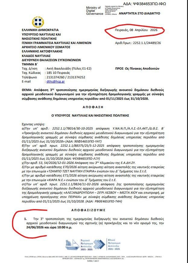 Το Υπουργείο Ναυτιλίας μετέθεσε εκ νέου την ημερομηνία του διεθνούς διαγωνισμού για τις 24 Ιουνίου 2026,παρατείνοντας την αβεβαιότητα για τον επιχειρηματικό κόσμο του Έβρου, που εδώ και ενάμιση χρόνο αναμένει μια ουσιαστική μείωση στο μεταφορικό κόστος.